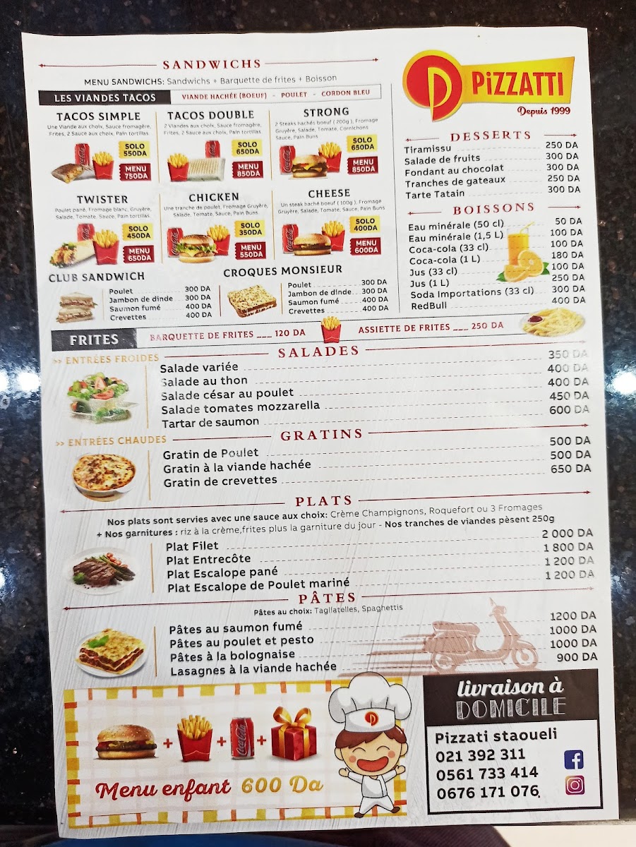 La Piazza Pizzatti Staoueli offers a variety of delicious options that cater to a wide range of tastes. The restaurant’s menu is a perfect blend of traditional Italian flavors with local influences. For pizza lovers, the Mega Pizza 4 Quart stands out, offering a hearty, satisfying meal with a combination of four distinct flavors in one large pizza. It's a great choice for those who love variety and a fulfilling bite. In addition to pizza, the restaurant serves a selection of pastas that are cooked to perfection, including creamy carbonara and rich Bolognese sauces. The warm ambiance and generous portion sizes make La Piazza Pizzatti Staoueli an ideal spot for a cozy meal with friends or family.